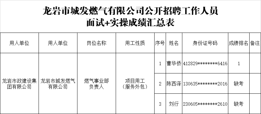 龍巖市政建設(shè)集團(tuán)有限公司公開(kāi)招聘工作人員面試+實(shí)操成績(jī)排名的公示